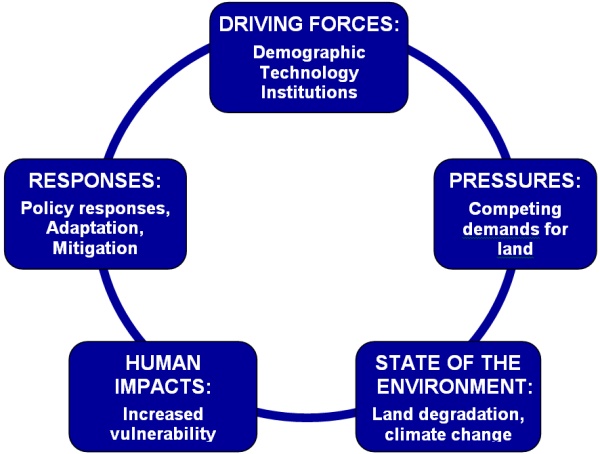 1. Driving Forces are underlying in form of population growth, technology and changes, institutional (political, market, cultural, social), structures, and changes. Land laws and markets affect land resources through how they impact on land management. There are typically nested interactions among these driving forces.