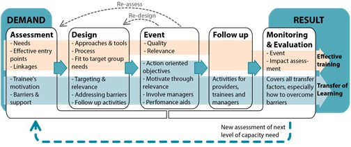 “Whether short or long-term in nature, all capacity development initiatives work best if they are viewed as a process, not an event. Such processes will always comprise some key components, namely: assessment, design, the two parts of the delivery phase (event and follow-up), and monitoring and evaluation, with iterative feedback loops and impact assessment incorporated at a number of points (…)”.7)