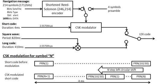 The LEX signal uses a Kasami series short code (2.5575 Mcps) with a chip length of 10230 and a 4 ms period, and a Kasami series long code (2.5575 Mcps) with a chip length of 1048575 and a 410 ms period. The short code is modulated by the navigation message using a 256-ary Code Shift Keying (CSK), which consists in replacing the short code with a left circle shifted version of it, the number of steps to be shifted representing the symbol value (JAXA, 2013).