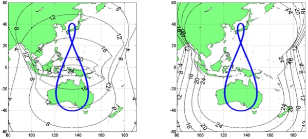 The left pot in Figure 3 shows the number of hours a day the QZS-1 satellite can be seen at more than 40º of elevation over the East-Asia and Oceania region. The right plot in Figure 3 show the estimated number of hours a day, at least one QZSS satellite will be over 40º of elevation. The LEX signal can be expected to be available 24-hours a day for most of the East-Asia and Oceania region by 2018 with three active HEO satellites.