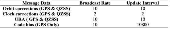 Table 2 shows the type of corrections included in the MADOCA messages and their update rates (as of November 2013). Currently the MADOCA messages include orbits corrections, clock corrections, User Range Accuracy (URA) and code bias for GPS satellites and orbit corrections, clock corrections and URA for the QZS-1 satellite. Planned future developments are the inclusion of GLONASS messages to allow multi-GNSS PPP and phase bias messages messages to allow PPP Ambiguity Resolution (PPP-AR).