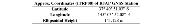 The fixed point tests described in this section were performed GNSS reference station (station ID: RJAP) near Melbourne, Australia. The ITRF08 coordinates of RJAP station, obtained from the NRCAN PPP service are presented in Table 4. The GNSS receiver, i.e. a Javad DELTA-G3T was connected to the Javad GrAnt-G3T antenna shown in Figure 6.