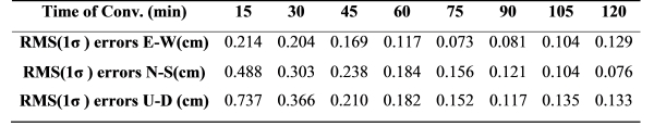 RMS positioning errors after 2 hours of convergence E/N/U: 0.081cm/0.036cm/0.115cm