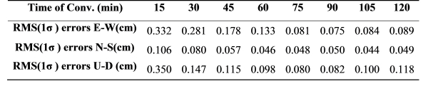 The 3-dimensional RMS errors 120 to 130 minutes after the start of each test are 0.200m, 38% higher than the RMS errors calculated from 120 minutes to the end of each test. For comparison, the RMS error values for different convergence times are shown in Table 8. Here also can be seen that 120 minutes are not enough to full convergence, the 3-dimensional RMS errors being 26% higher than the final value.
