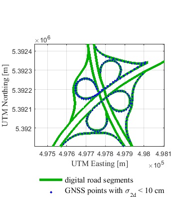 For the evaluation of absolute positional and shape accuracy of road segments in the given digital maps and hence the comparison of map quality between commercial, official and free datasets, precise kinematic reference trajectories based on differential carrier-phase GNSS positioning were generated using a high-end geodetic GNSS two-frequency receiver (Leica Viva GS15) mounted on a land vehicle with CS15 field controller. The final coordinates of the kinematic GNSS tracks in the Universal Transverse Mercator (UTM) system with accuracies better than 10 cm were computed by a specialized GNSS baseline processing software, named Wa2 (Wa2, 2015), which provides a reliable and precise offline solution as well as a detailed output protocol.