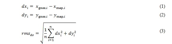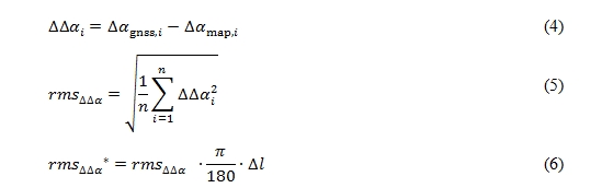 at the GNSS points that are derived from the reference trajectory comparing to the homologous nodes or shape points of  linear features in the digital map. Here the RMS values of ∆∆α and ∆κ are calculated according to the equations (6) and (8).