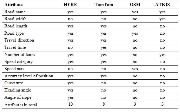 Obviously, the four datasets of spatial road net-work data are within the absolute accuracy values specified in the literature, while the relative positional error of TomTom and ATKIS has slightly exceeded 1 meter. It has to be mentioned that there are also road data with lower levels of positional accuracy that do not fulfil the ADAS requirement. The results of accuracy assessment of such comparably inaccurate road segments based on only one autobahn entrance and two autobahn exit ramps show that the absolute positional accuracy is about 4 meters, while the level of the relative positional accuracy remains at around 1 meter. In addition to positional accuracy, attribute completeness of geographic data is also one of the main quality elements of our investigation (Wiltschko & Kaufmann, 2005). Table 2 summarizes several relevant attributes for vehicle telematics applications (such as routing and navigation) that are contained in our spatial databases: Here, TomTom, OSM and ATKIS-Basis-DLM, respectively. Although OSM and ATKIS, as shown in the table below, lack the attribute of travel direction, the disadvantage has been compensated by our own acquired information.