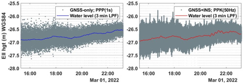 Figure 5 Instantaneous water levels (gray dots) at experiment location #1. Left panel: PPP results (1 Hz) from affordable GNSS. Right panel:  PPK results from survey-grade GNSS+INS (50 Hz). The blue and red lines are the water levels using the 3-minute LPF cutoff.