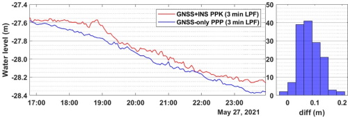 Figure 8 Left panel: averaged water levels from GNSS-only and GNSS PPK results aboard SeaTrac (USV) at location #2. Right panel: averaged water level difference.