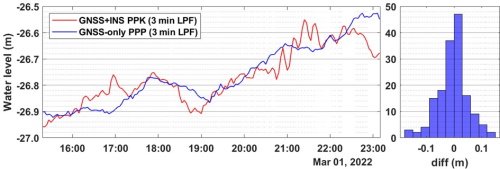2. Validate PPP-derived water level from an affordable GNSS receiver, using results from a geodetic grade GNSS+INS sensor in the PPK strategy