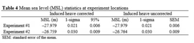 Passing the instantaneous PPP results for experiment 1 with the induced-heave corrections applied through the 3-minute LPF shows that the resulting water levels have a near-zero difference (1 cm) for most epochs (75th percentile) compared to the statistics for water levels from GNSS-only PPP results without induced-heave corrections. However, LPF reduces the induced heave from ± 13 cm in extreme cases (outside 0.01 and 99.99 percentile bounds) to near zero (± 0.3 cm). That agrees somewhat with Dodd, 2009’s comment about the induced heave effect reducing drastically to  ~ 2 cm from 10 cm in a 6-minute LPF cutoff. The induced heave effects and characteristics in experiment 2 results are similar to those described afore