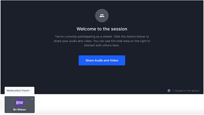 A session is a ‘virtual roundtable or room’ where up to 20 people can participate (video/audio on) and up to 500 attendees can watch.
