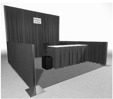 Below you can find an example of how your booth will look at the exhibition. The pipe and drapes will be white and dark-blue.