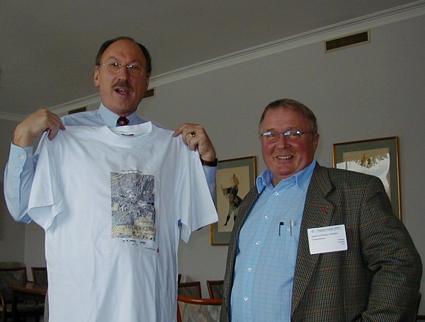 President Magel and Mr. Kjeld Lohmann Schøler, Secretary General of DdL with a t-shirt with a printed map with the FIG office in Copenhagen in the middle.