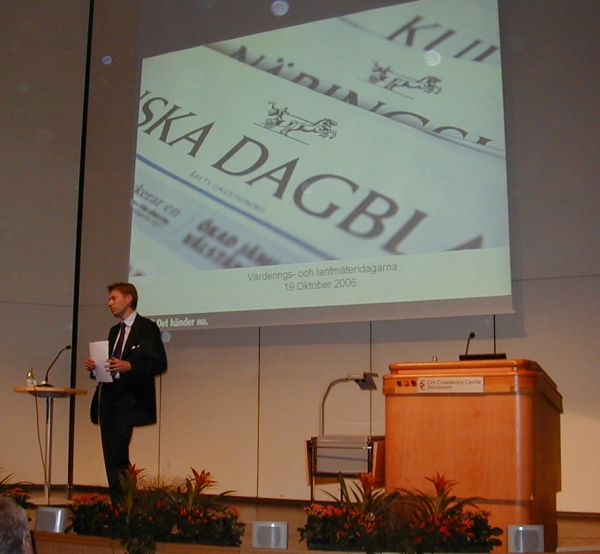 FIG Director Markku Villikka visited the Swedish Surveying and Valuation Conference in Stockholm 18-19 October 2006. This annual natioanal conference was attended by about 400 participants who listened for two days on presentations on surveying, valuation and real estate management. Several presentations were focussing on case studies on recent project and legislation changes in Sweden. The presentation of the FIG Director was about international trends and outcome from the FIG Congress in Munich that ended the previous week. Even though the conference was a national event there were some participants from other Nordic countries.