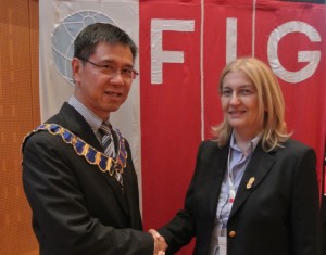 FIG President CheeHai Teo (2011-14) greets Chryssy Potsiou with the election for President 2015-18