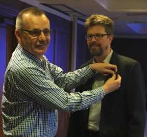 Vice President Rudolf Staiger gives the FIG Pin to Mikael Lilje