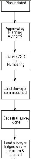 Once the planning authority has approved development of particular parcels of land, that plan is forwarded to the Ministry of Lands for numbering after which advice on commissioning land surveyors to carry out the survey is given to the client. The commissioned land surveyor then carries out the survey, prepares the necessary records and lodges them for examination at the Zambia Survey Department (ZSD).