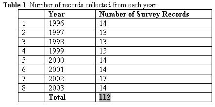 After literature review 112 survey records were randomly picked from the Plan Room covering the period 1996 – 2003 (see table 1 and appendix 1). From these records the following information was collected; parcel number, examiner, survey record number and who carried out the survey (government or private).