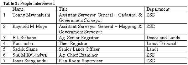 The Author would like to acknowledge the financial support from the FIG Foundation in Copenhagen and material support from the Department of Geomatic Engineering at the University of Zambia (UNZA), without which carrying out this research would have been very difficult. The willingness to give information by all those interviewed is also highly acknowledged as they made the research successful. The efforts, encouragement and assistance of Chama Manda and Yamikani Mwanza in carrying out this research are equally highly appreciated too. The encouragement the author received from the Surveyor General, his assistant for cadastral services, the School of Engineering Research Coordinator, UNZA and the President of the Surveyors Institute of Zambia (SIZ) is also acknowledged. Dr A Mulolwa is being acknowledged for reviewing this report at short notice and indeed all those who contributed directly and indirectly.