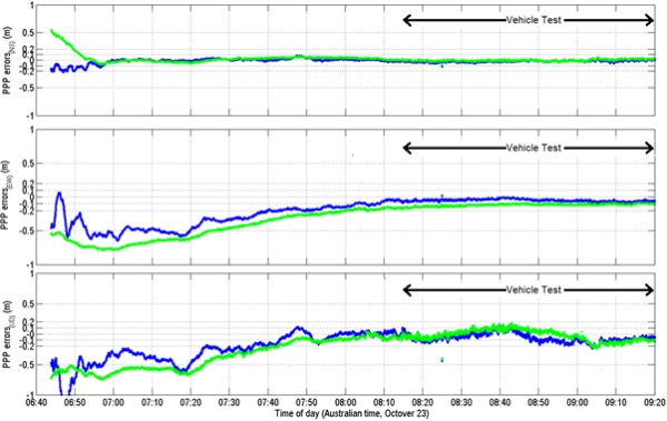 The results in Table 5 are calculated without taking into account the first 2 hours to give time for the PPP solution to converge. The 3-dimensional RMS error for PPP using MADOCA-LEX solutions was 0.041m, which is about 25% larger than the case where IGS-RT products were used. The time series for the first 12 hours of the static tests is shown in Figure 7, MADOCA-LEX solutions are shown in blue, IGS-RT solutions are shown in green. Two hours is an appropriate convergence time for the PPP solutions in the test.