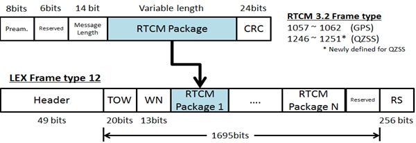 The MADOCA-LEX messages are coded within the 1695 bits of data following a format derived from the RTCM 3.2 standard as illustrated in Figure 4. Of the 1695 bits allocated for data, 33 bits are used to transmit the time in which the LEX message is transmitted. The contents of the RTCM 3.2 frame, with the exception of the header and parity check bits, are allocated in the remaining 1662 bits.