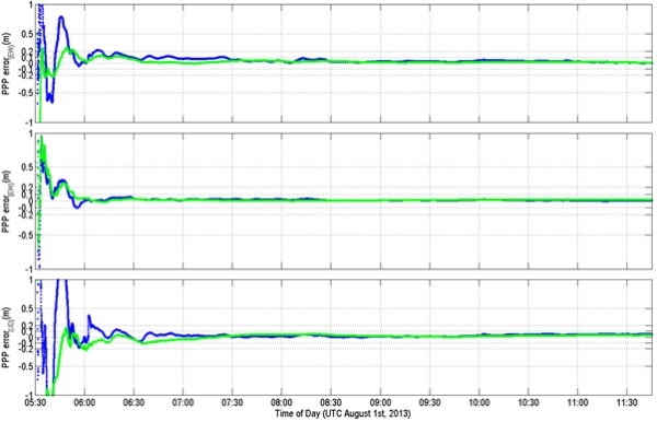 Figure 7. Performance of static PPP using MADOCA-LEX products (Blue) and IGS-RT products CLK11 (Green). RMS errors were E/N/U: 0.029m/0.012m/ 0.026m for MADOCA-LEX.