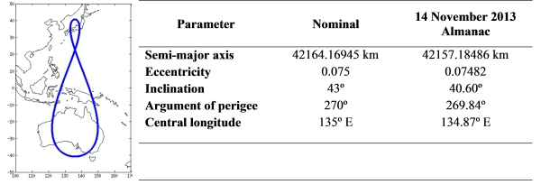 In order to cover the East-Asia and Oceania region, the QZSS will make use of HEO and GEO satellites. The first satellite, QZS-1 intended to be used for system evaluation was launched in a HEO orbit. The orbit parameters and ground track the of QZS-1 satellite are presented in Table 1. The proposed two HEO satellites to be launched by 2018 are expected to have the same ground track with eight hours of offset, i.e. the same semi-major axis, eccentricity, inclination and perigee with ±120° offset in right ascension angle. All QZSS satellites have a mean anomaly of 135° E central longitude. This orbit has good coverage over East-Asia and Oceania region, with a high elevation at around 135° E meridian and between 40° S and 40° N latitude.