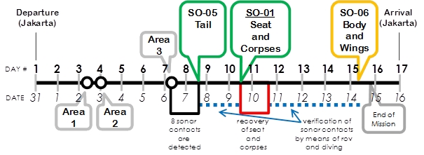last contact from the airplane), Area-2 (where debris and bodies from