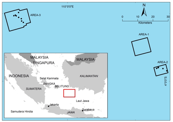 Sea, Indonesia. Three survey zones were covered: Area-1 (the position of